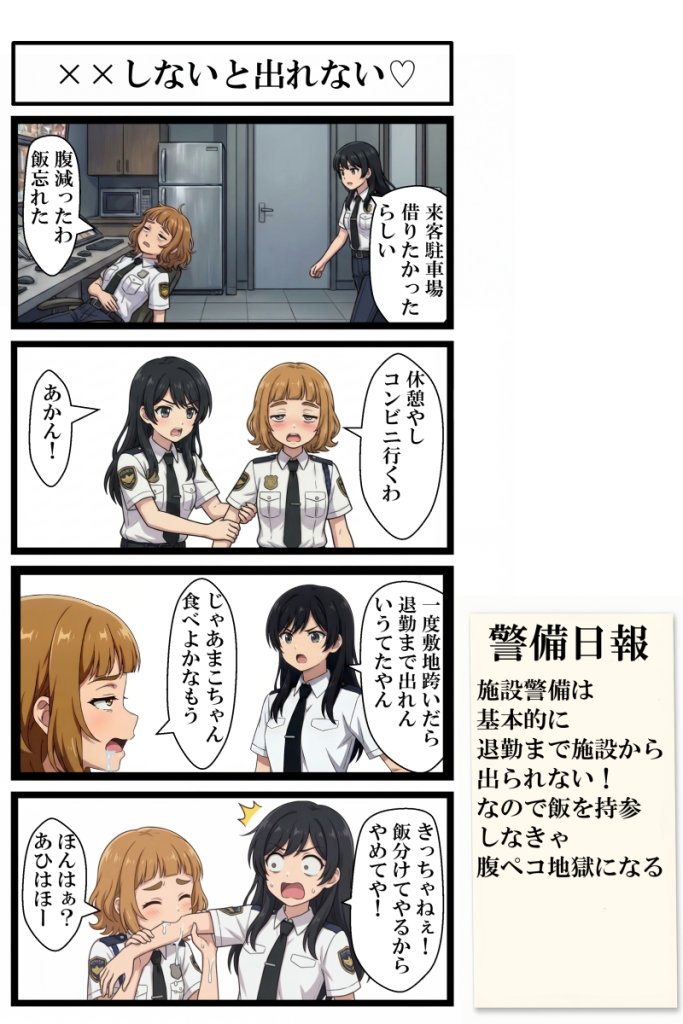 ・施設警備は基本的に退勤まで施設から出られない!なので飯を持参しなきゃ腹ペコ地獄になる