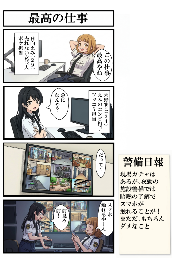 ・現場ガチャはあるが、夜勤の施設警備では暗黙の了解で、スマホが触れることが