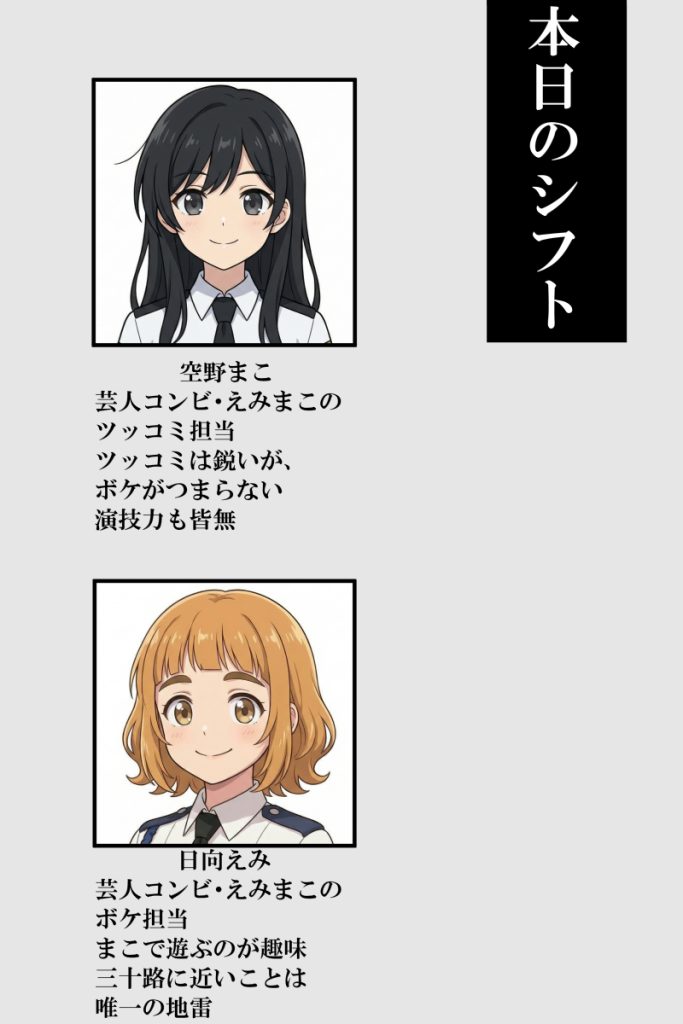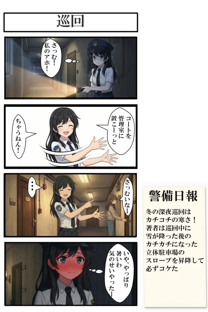 第2話では、夜勤中の眠気や寒さなど、施設警備の中でも特に“地味にしんどい部分”をまこ視点で描きました。仕事ネタを入れつつ、まこの空回り気味なテンポが出るよう意識しています。