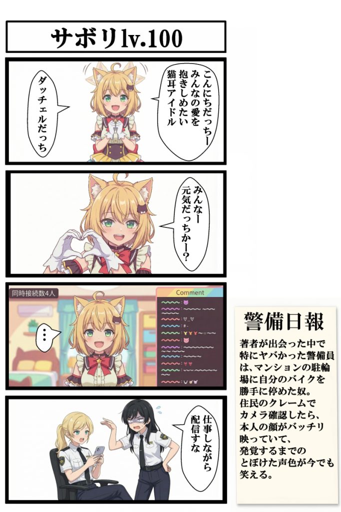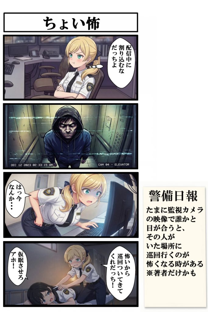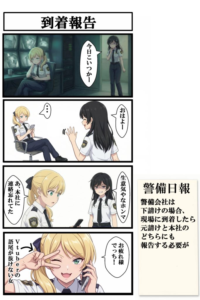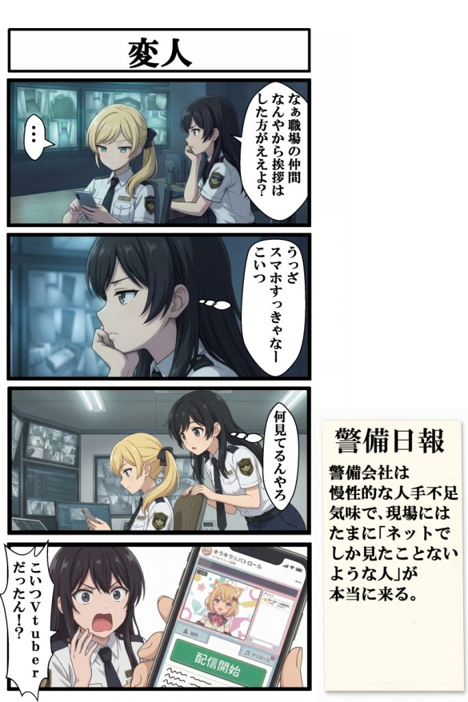 オリジナル4コマ漫画『しせつけいび』第7話は、現場到着時に必要な報告業務や、挨拶を返さない同僚との微妙な空気感、勤務中にもかかわらず配信者のノリが抜けない新キャラ・天羽るいの登場を描いた回です。施設警備の現場には時折“本当にこんな人いるのか”と思うような人物が現れることがありますが、今回はそんな現場の妙なリアリティを、監視カメラ越しの怖さや巡回の気まずさも交えてコミカルにまとめています。